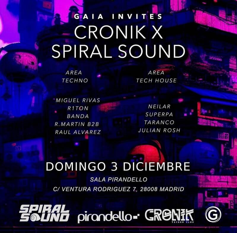 Para empezar bien diciembre volvemos el día 3 con la presentacion de GAIA. Colaboración de SPIRAL SOUND con CRONIK y de la mano de los DJ’s con más bombo de todo Madrid